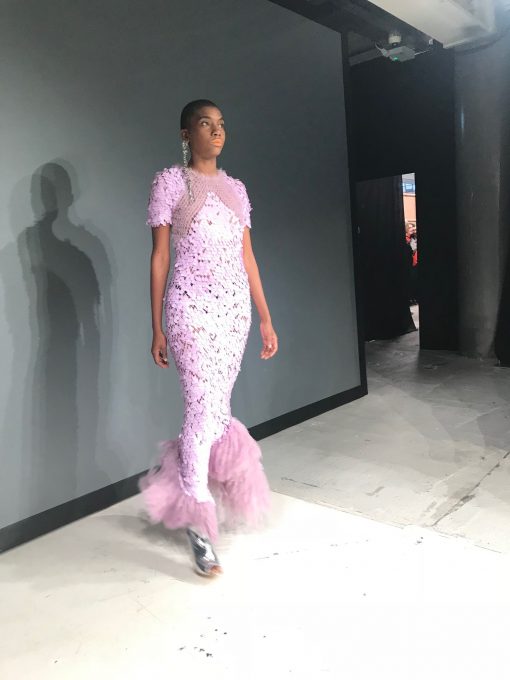 Mark Fast showcased his AW18 collection at 180 Strand in Covent Garden. The collection has a Greek goddess motif with sequin maribou yarns and beaded metallic knits. Party dresses carry banded lycra and feathers in a vibrant array of colors: peacock green, white, blush lilac, and black. My favorite dresses included a white feather and beaded gown with a black yarn netted neck, a peaclock green feathered and metallic yarn dress, a lilac beaded and feathered yarn dress, and an off white yarn fringed mini dress. All of the looks are sophisticated and attention-grabbing with impeccable detailing!