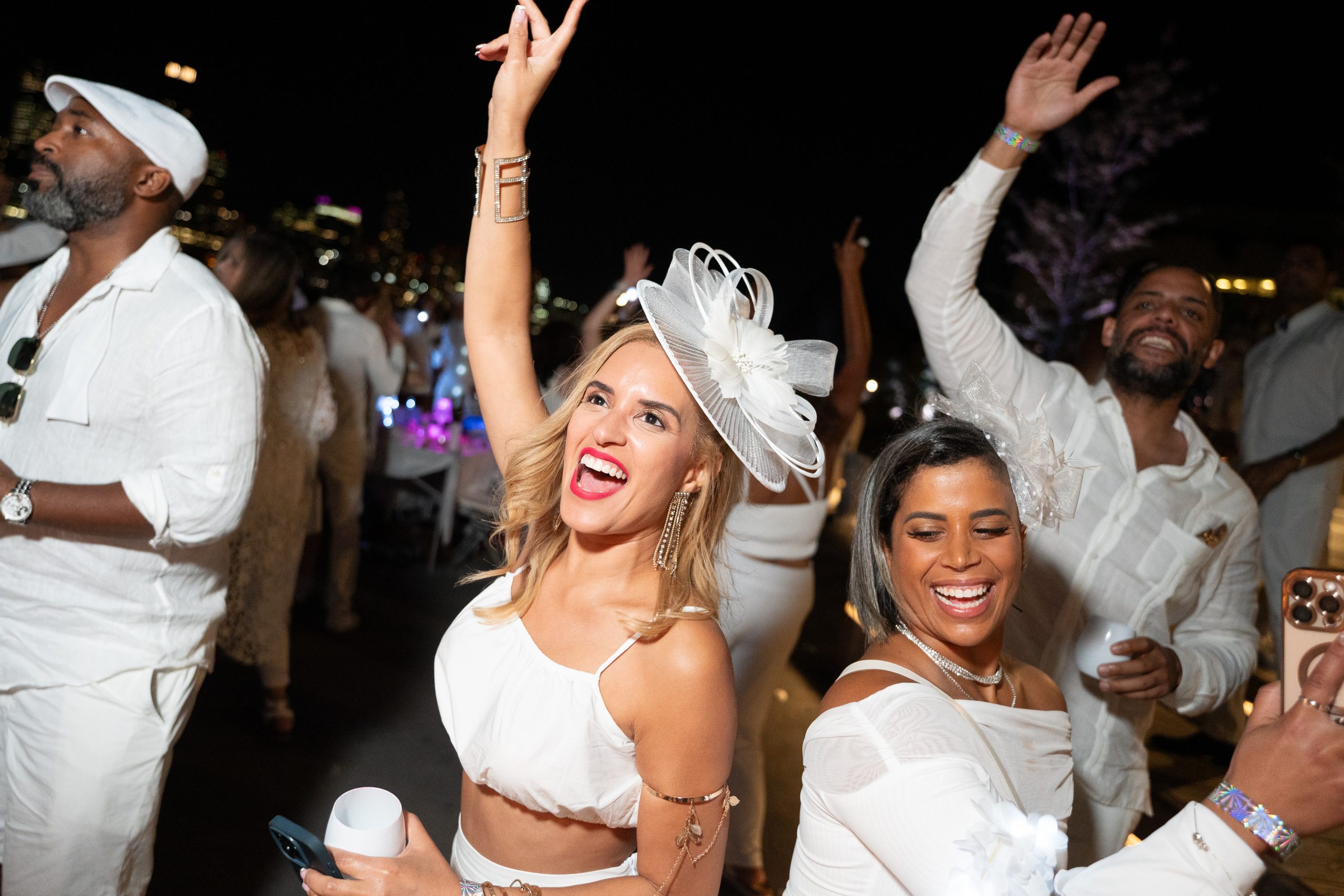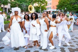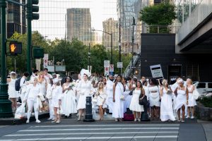 Diner en Blanc NYC brought incredible energy to the city last Friday! Guests found out only hours before the event that the location would be Robert Wagner Park in Battery Park. What an incredible venue for the wonderful celebration! Over 4000 guests dressed in beautiful white ensembles and brought creative white decorations to the event. This year had a theme called Blooming Elegance and everyone definitely showcased their floral game! Watching everyone wave their napkins to begin the event was magical!