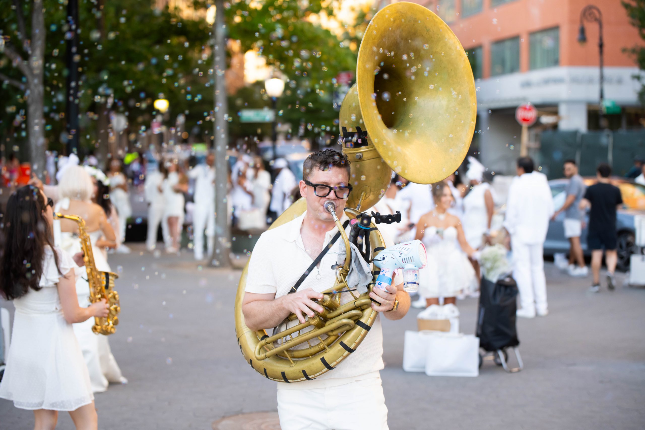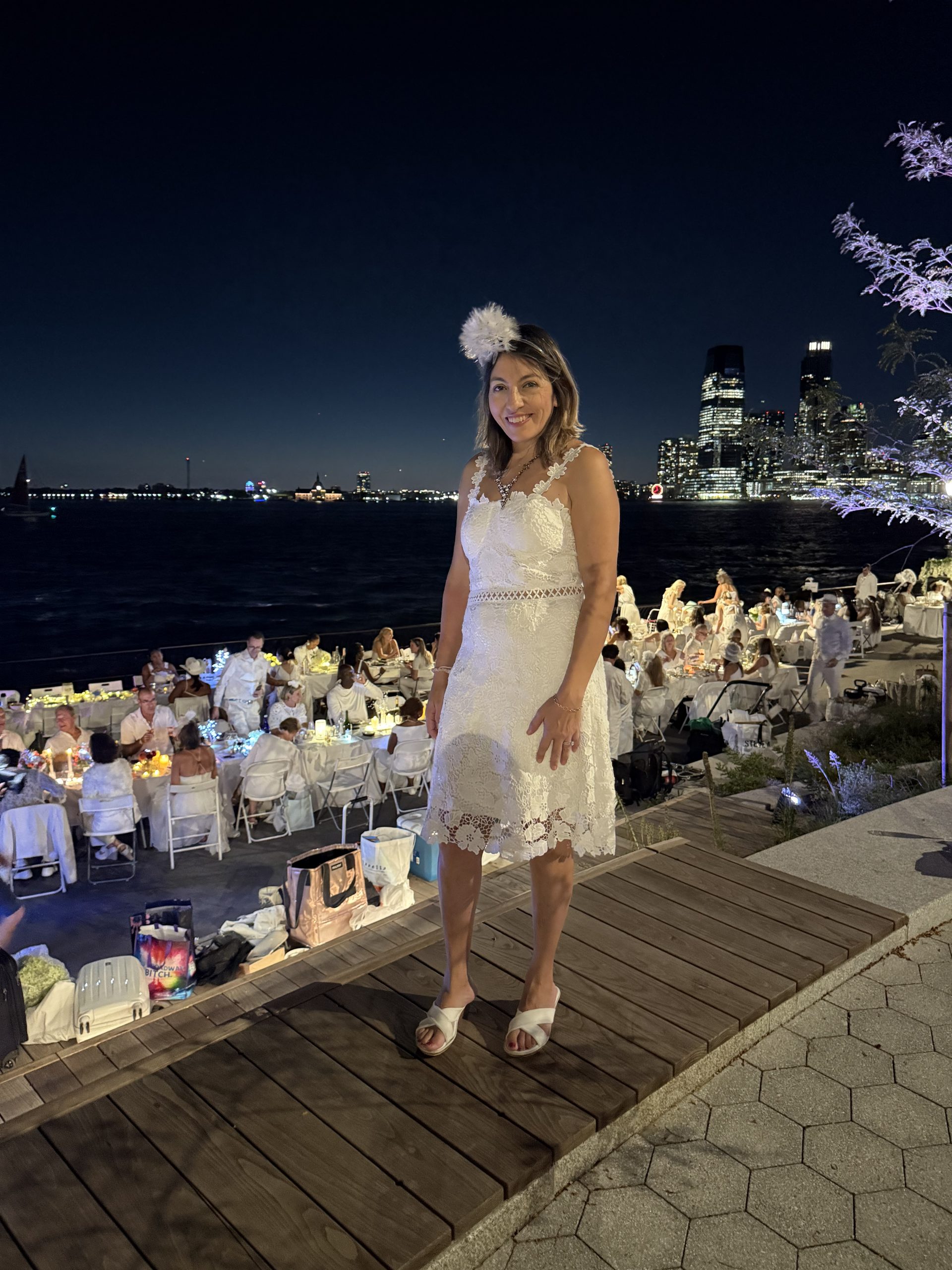 As the evening continued, I enjoyed walking around and getting a close look at everyone’s decorations. I saw everything from white neon signs, elaborate chandeliers, innovative floral arrangements, to white feathers. Diner en Blanc brought an incredible display of white decor, festive energy, and camaraderie. Cheers to a captivating celebration!